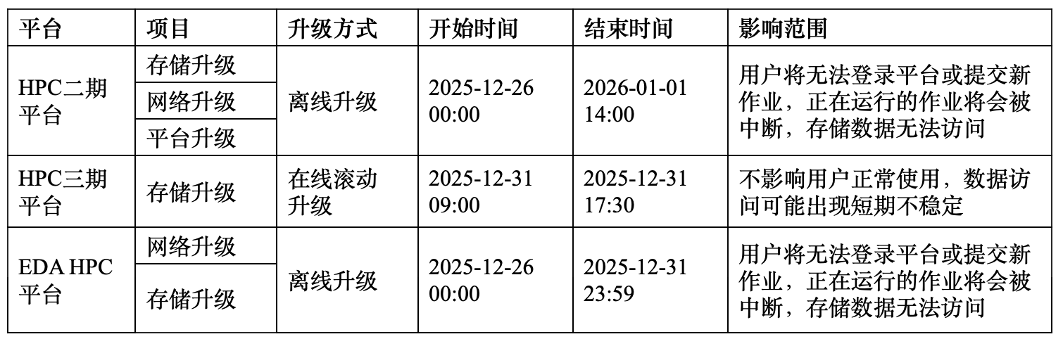 - HPC三期平台:采用在线滚动升级方式(2025-12-31 09:00 至 2025-12-31 17:30),升级期间不会影响用户任务及平台正常使用,但可能出现数据访问不稳定的情况。